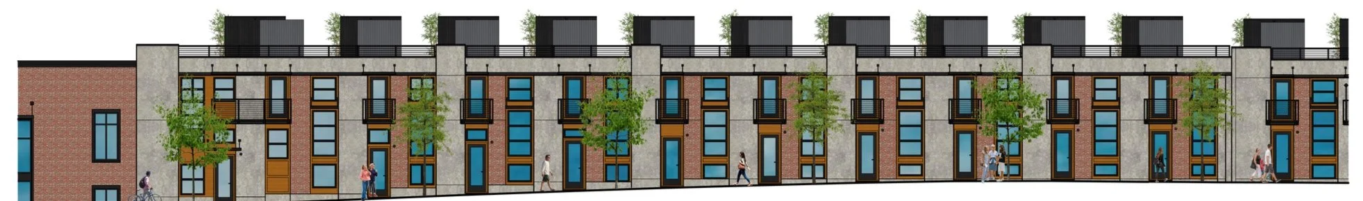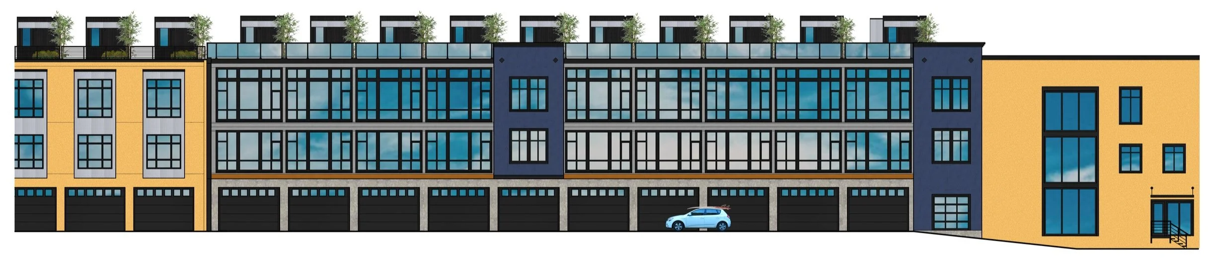 In the next ten units, the North wall is brick and will be removed completely. It will be replaced with large noise reducing glass walls. The new North wall will cantilever over the driveway, allowing for more living space on L-2, L-3, and on the roof terrace, than in the previous six units.