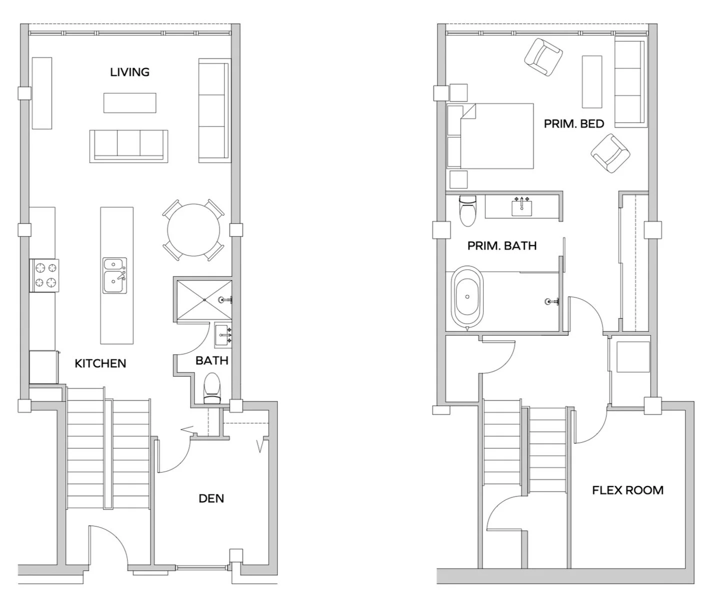 Residential lofts are sold as vertical 4-floor sections of the Union Building. Each loft consists of a first floor two-car garage with a utility and storage area, a second floor sleeping area, third floor living and kitchen area, and a fourth floor rooftop terrace. Each loft section is between 1,300 - 1,500 square feet, excluding the rooftop area and garage.